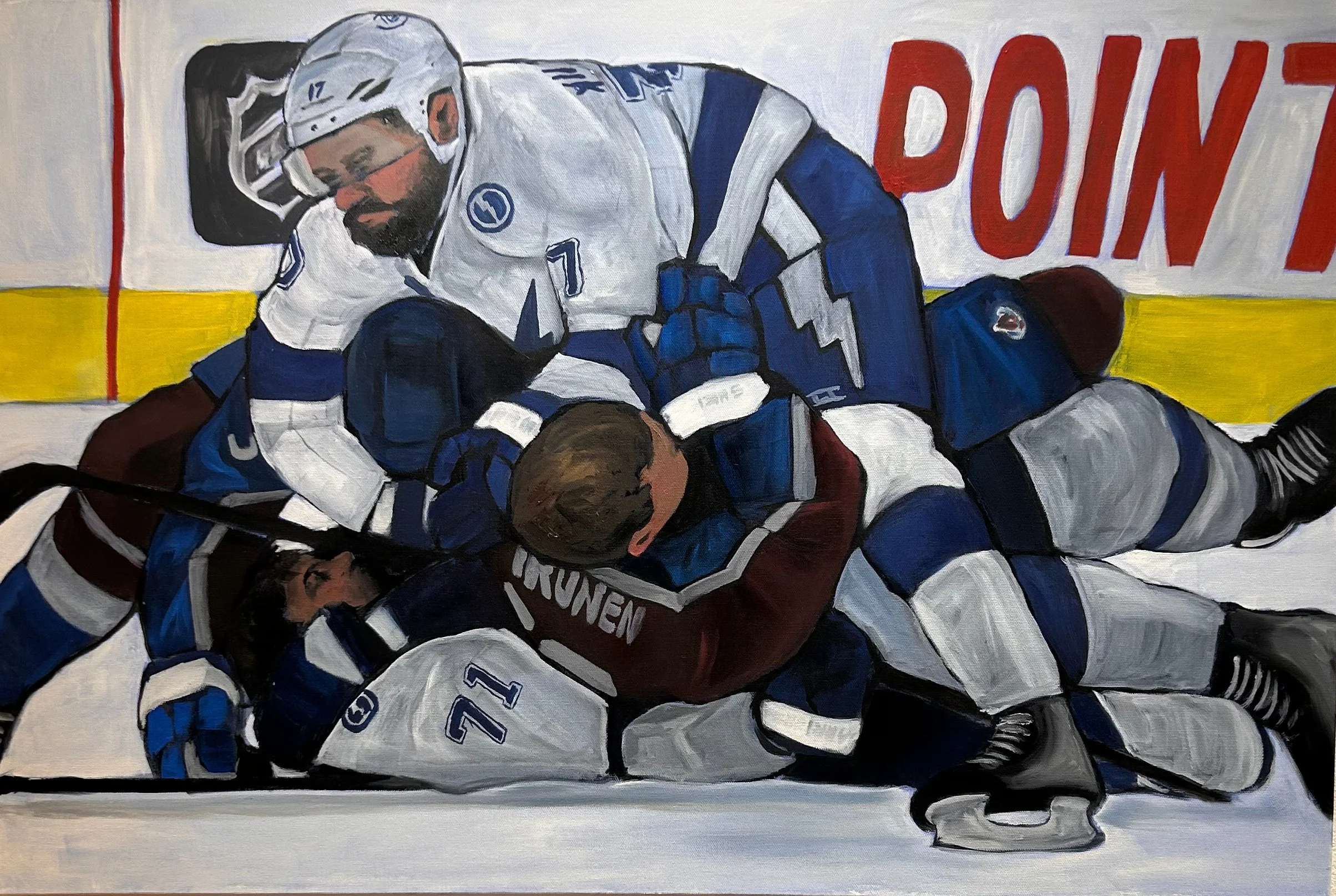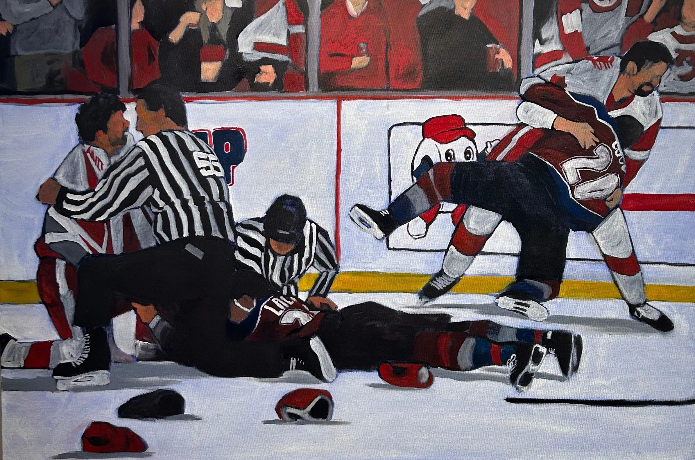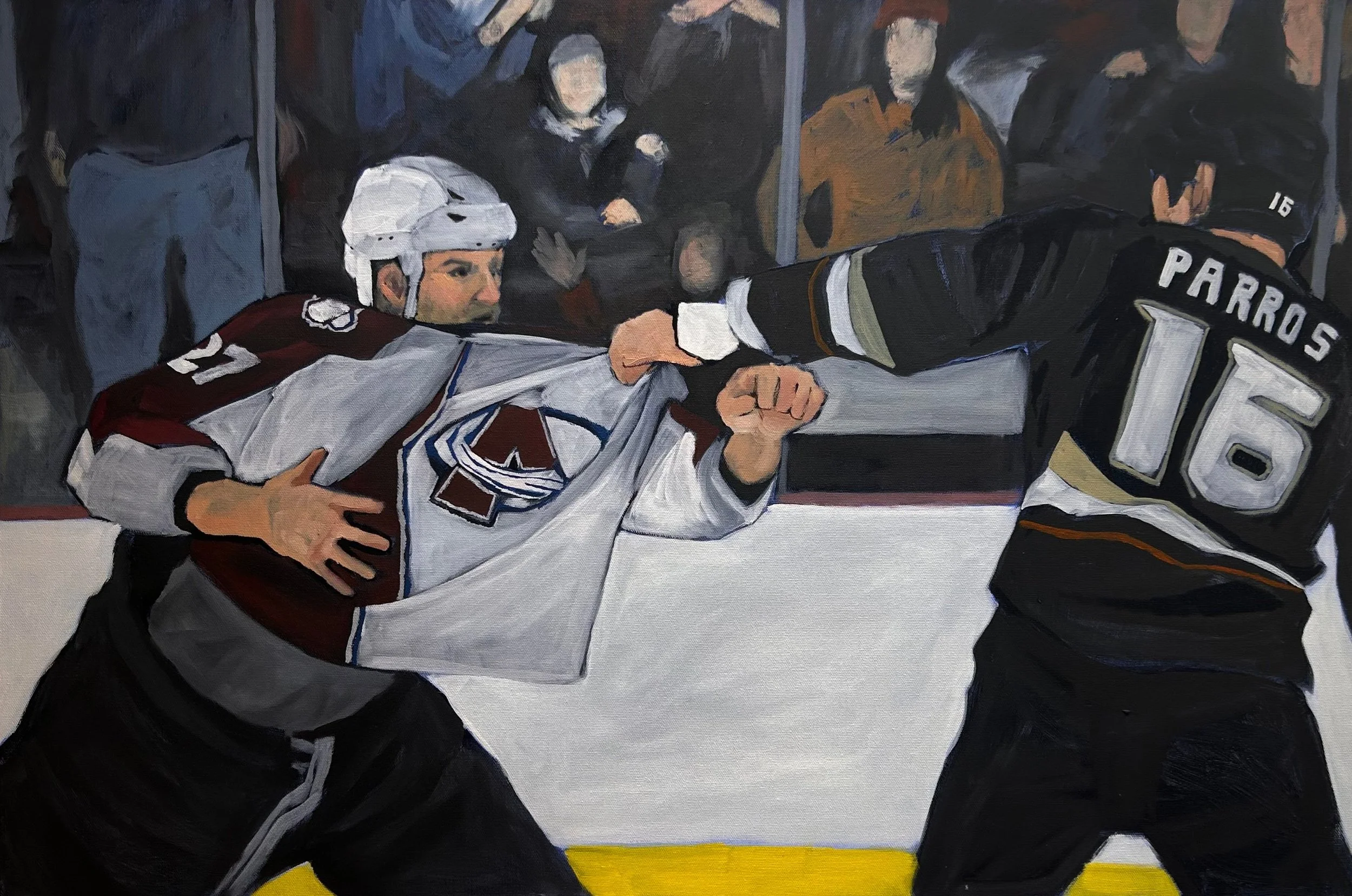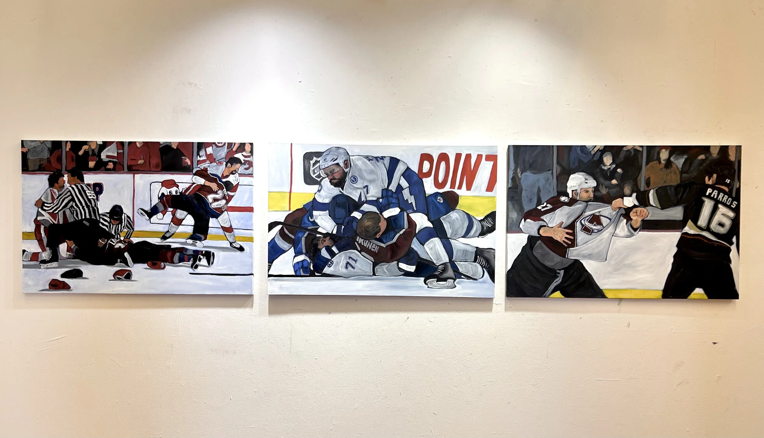 Avalanche Triptych Gloves Off - 2023. Oil on canvas - 24 x 36 in Dogpile - 2023. Oil on canvas - 24 x 36 in Spat - 2023. Oil on canvas - 24 x 36 in